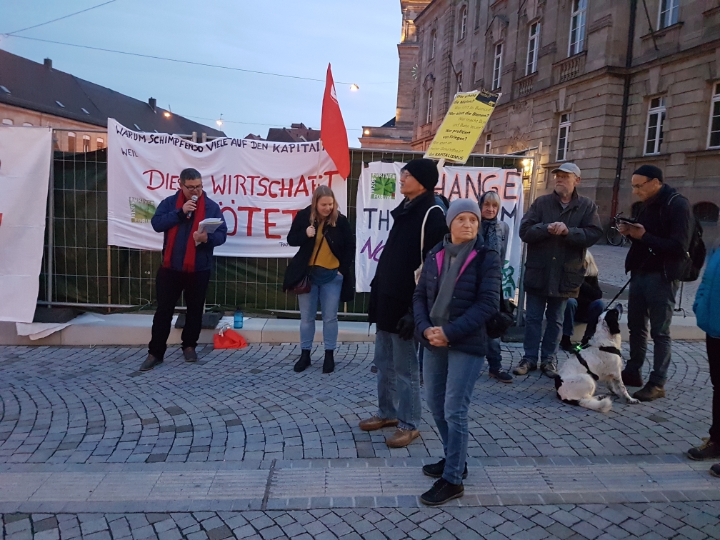 Ja warum wohl? Dazu gibt es eine Menge zu sagen, deshalb rief die Linke Fürth zu einer Kundgebung vor dem Stadttheater auf, an der auch wir uns beteiligt haben. Uns fällt dazu z.B. ein, wie unglaublich verächtlich es ist, die berechtigte Kritik der Menschen, die unter den Verwüstungen des Kapitalismus zu leiden haben, als „Schimpfen“ zu bezeichnen. Damit suggeriert man ein inhaltsloses „Meckern um des Meckerns willen“ von Leuten, die nur nicht merken, dass es ihnen eigentlich gut geht. Deutlicher kann sich die menschenverachtende Ideologie des Kapitalismus ja eigentlich gar nicht selbst darstellen.